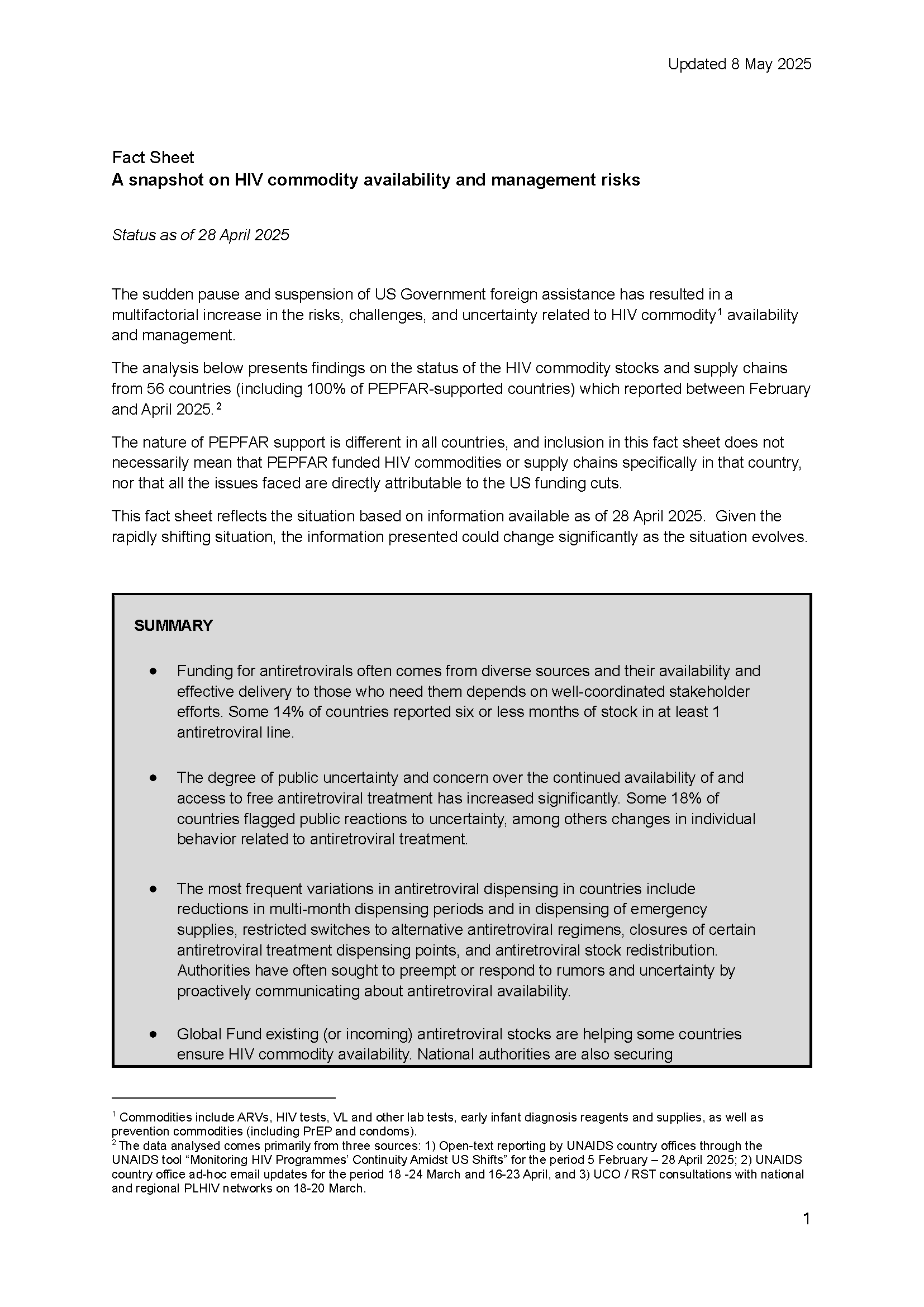 01 May 2025 01 May 2025The sudden pause and suspension of US Government foreign assistance has resulted in a multifactorial increase in the risks, challenges, and uncertainty related to HIV commodity[1] availability and management.