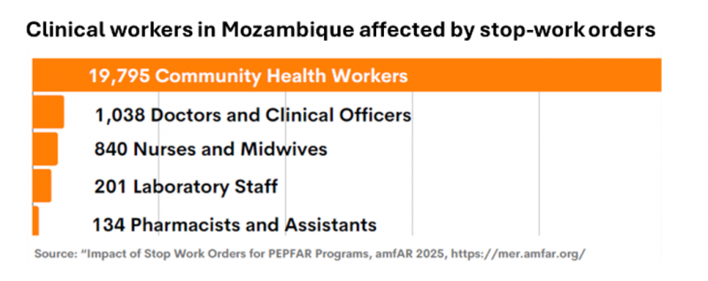 UNAIDS is offering its funding data and data on health system capacity to triage support to countries as they adapt to disruptions. For countries that are highly reliant on external assistance, particularly from the United States, there may be large numbers of health workers and other critical personnel (e.g. data managers) affected by the stop-work order. The chart below shows that nearly 20,000 health care providers supporting HIV services in Mozambique have received stop-work orders.