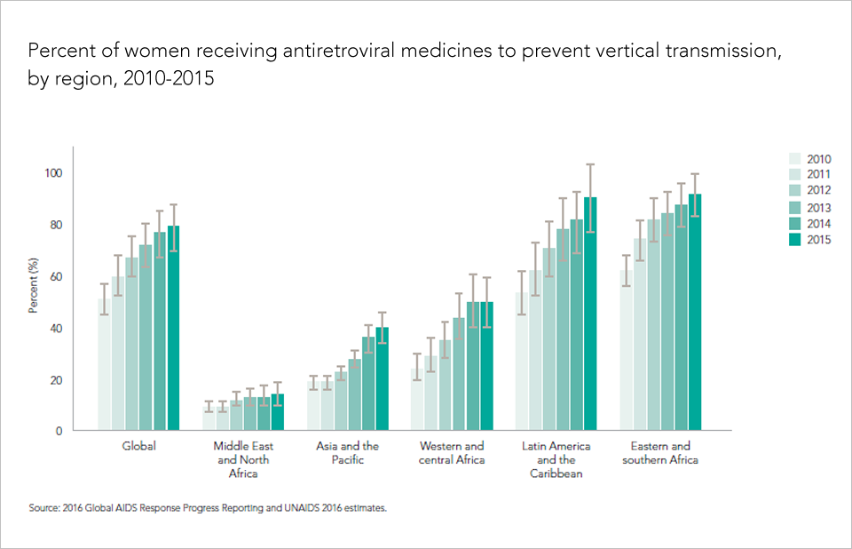 Percent of women receiving antiretroviral medicines to prevent vertical transmission, by region, 2010-2015