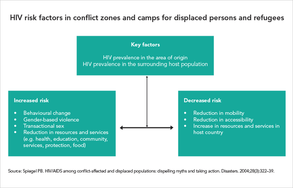 How HIV transmission is affected by emergencies is complicated and includes an interconnected mixture of exacerbating and diminishing vulnerability and risk factors that are context-specific.
