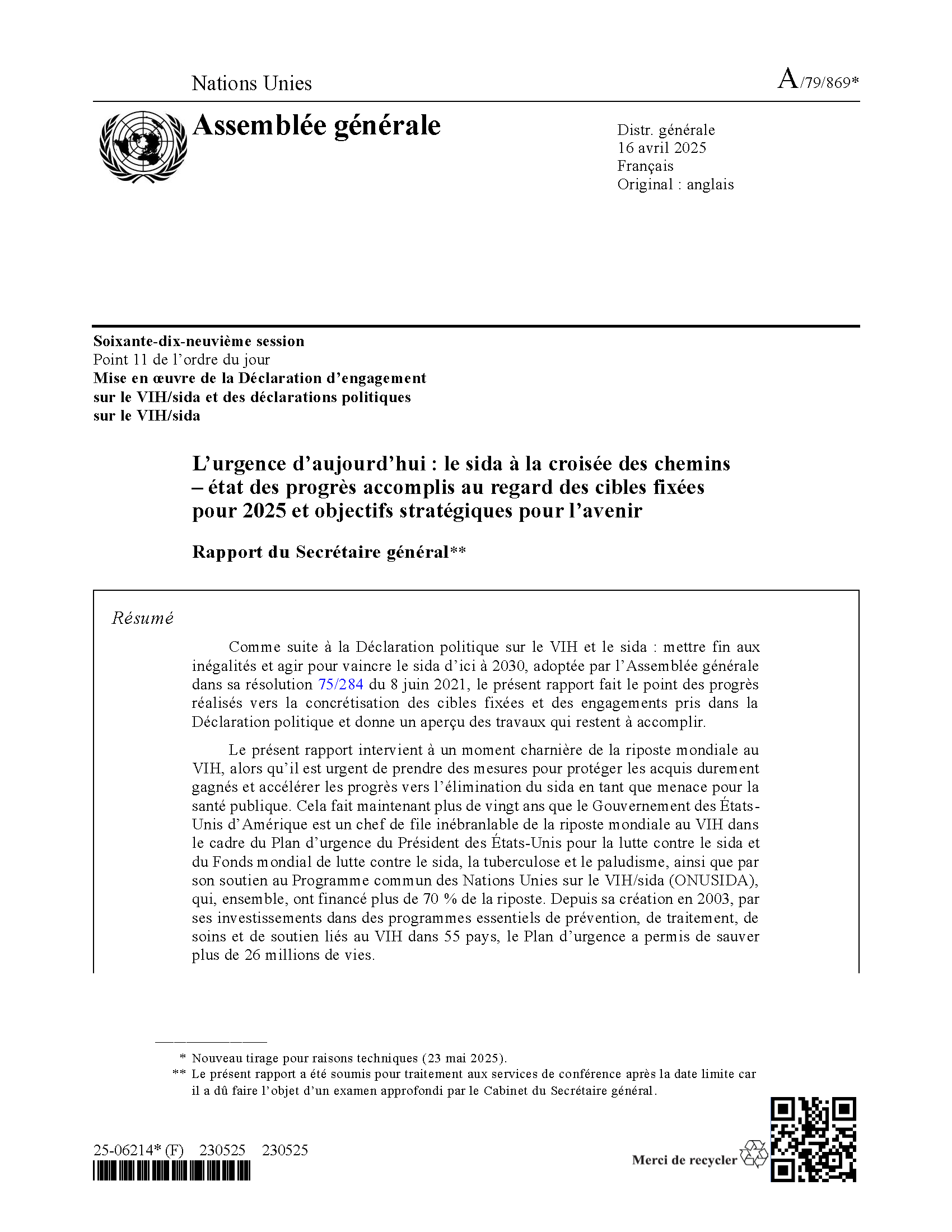 Rapport du Secrétaire général - Mise en oeuvre de la Déclaration d’engagement sur le VIH/sida et des déclarations politiques sur le VIH/sida - Nations Unies A/79/869 - Assemblée générale - 16 avril 2025 - Soixante-dix-neuvième session - L’urgence d’aujourd’hui : le sida à la croisée des chemins – état des progrès accomplis au regard des cibles fixées pour 2025 et objectifs stratégiques pour l’avenir