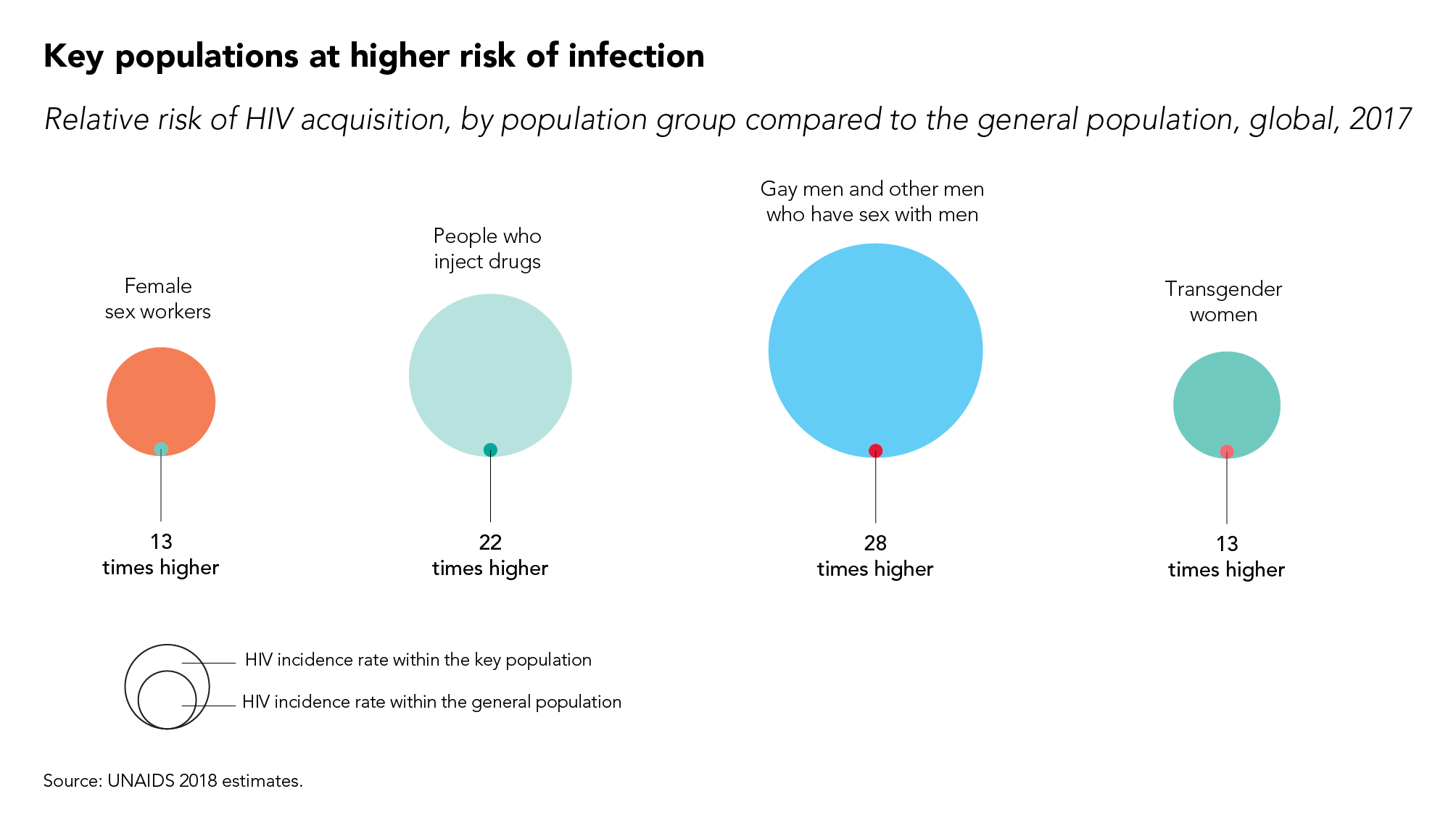 Les personnes issues des populations clés sont beaucoup plus exposées au risque de contracter le VIH. Les données disponibles montrent que le risque de contracter le VIH chez les hommes gays et les autres hommes ayant des rapports sexuels avec des hommes était 28 fois plus élevé que chez les hommes hétérosexuels en 2017. De même, le risque de contracter le VIH chez les consommateurs de drogues injectables était 22 fois plus élevé que chez les non-consommateurs, 13 fois plus élevé chez les professionnelles du sexe que chez les femmes adultes âgées de 15 à 49 ans et 13 fois plus élevé chez les femmes transgenres que chez les adultes âgés de 15 à 49 ans.